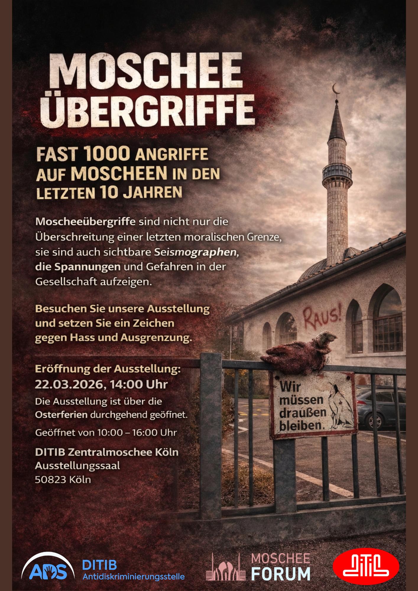 Köln, 23.03.2026 – Am gestrigen Sonntag (22.03.2026), wurde in den Räumlichkeiten der Kölner Zentralmoschee die Ausstellung „Moscheeübergriffe - Fast 1000 Angriffe in den 10 letzten 10 Jahren“ eröffnet, welche eine Übersicht von Übergriffen auf Moscheen in Deutschland zeigt und zur gesellschaftlichen Sensibilisierung beitragen soll. Die Ausstellung wurde von der Antidiskriminierungsstelle der DITIB organisiert, die seit über 10 Jahren Moscheeübergriffe dokumentiert und jährlich in einem Bericht veröffentlicht.