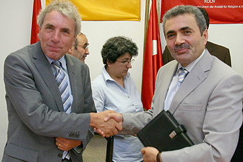 ![]() Im Anschluss an seine Rede überreichte Arslan Roters ein Buch von Prof. Dr. Ali Bardakoğlu, dem Präsidenten des türkischen Religionsamts sowie eine Infomappe über die DITIB.