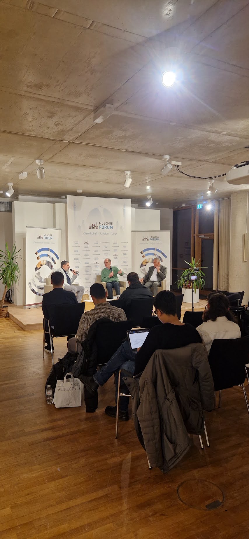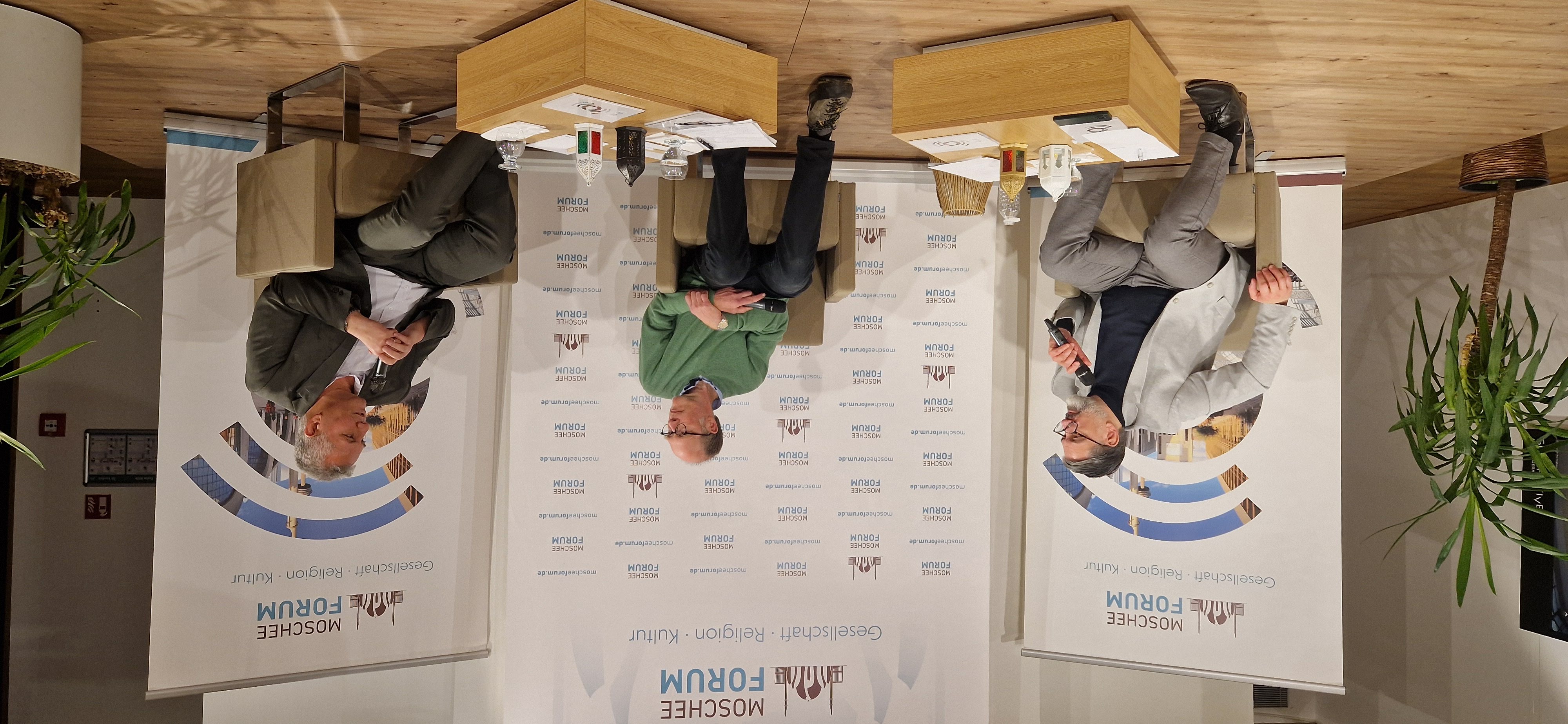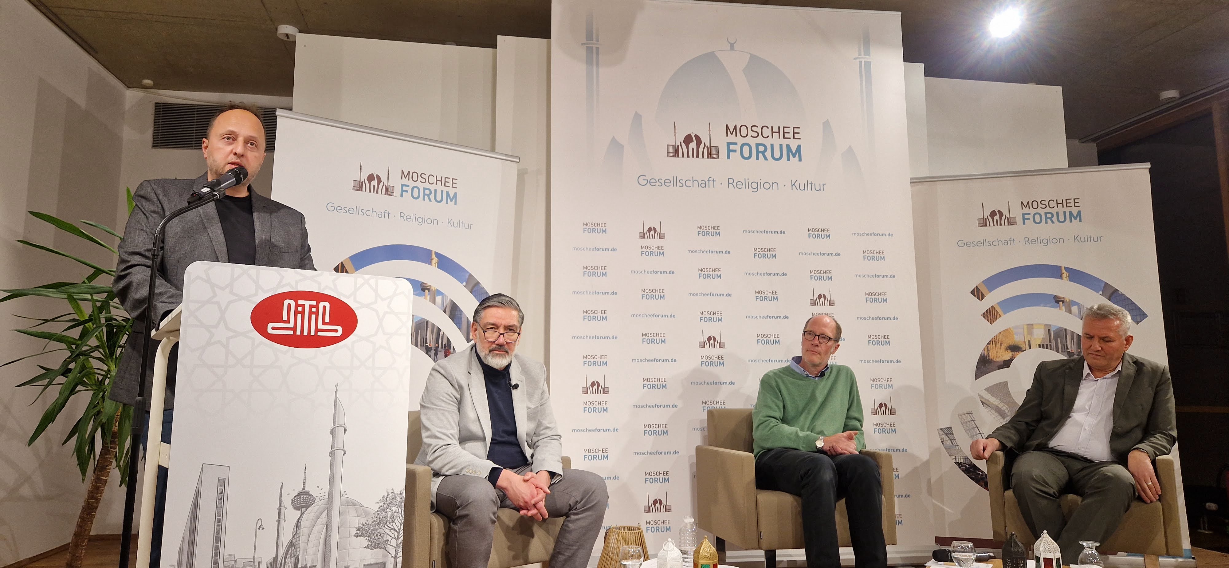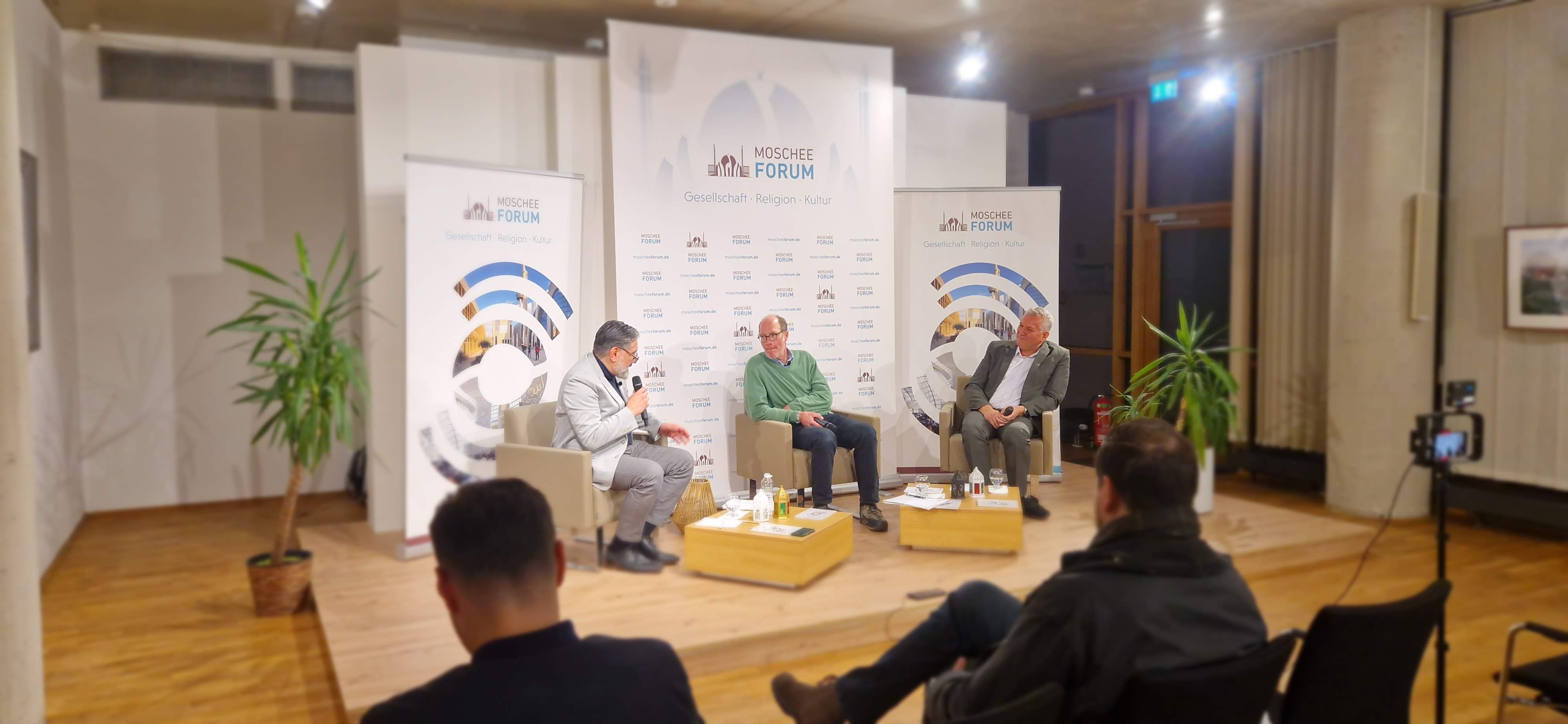 Im Mittelpunkt dieser ersten Veranstaltung stand die Frage, wie muslimische Religionspraxis in den Moscheen tatsächlich vermittelt wird – etwa in Freitagspredigten – und warum das Bild „der Moschee“ in Medien und Politik häufig von Vorurteilen geprägt ist. Den Ausgangspunkt bildete ein Forschungsprojekt zu Freitagspredigten in deutschen Moscheen, vorgestellt von Dr. Jörn Thielmann, Leiter des Zentrums für Islam und Recht in Europa (EZIRE) an der Friedrich-Alexander-Universität Erlangen-Nürnberg. Als weitere Gäste nahmen der Journalist und Islamwissenschaftler Abdul Ahmad Rashid sowie Dr. Zekeriya Altuğ, Leiter der Abteilung Gesellschaft und Zusammenarbeit im DITIB-Bundesverband, auf dem Podium teil.