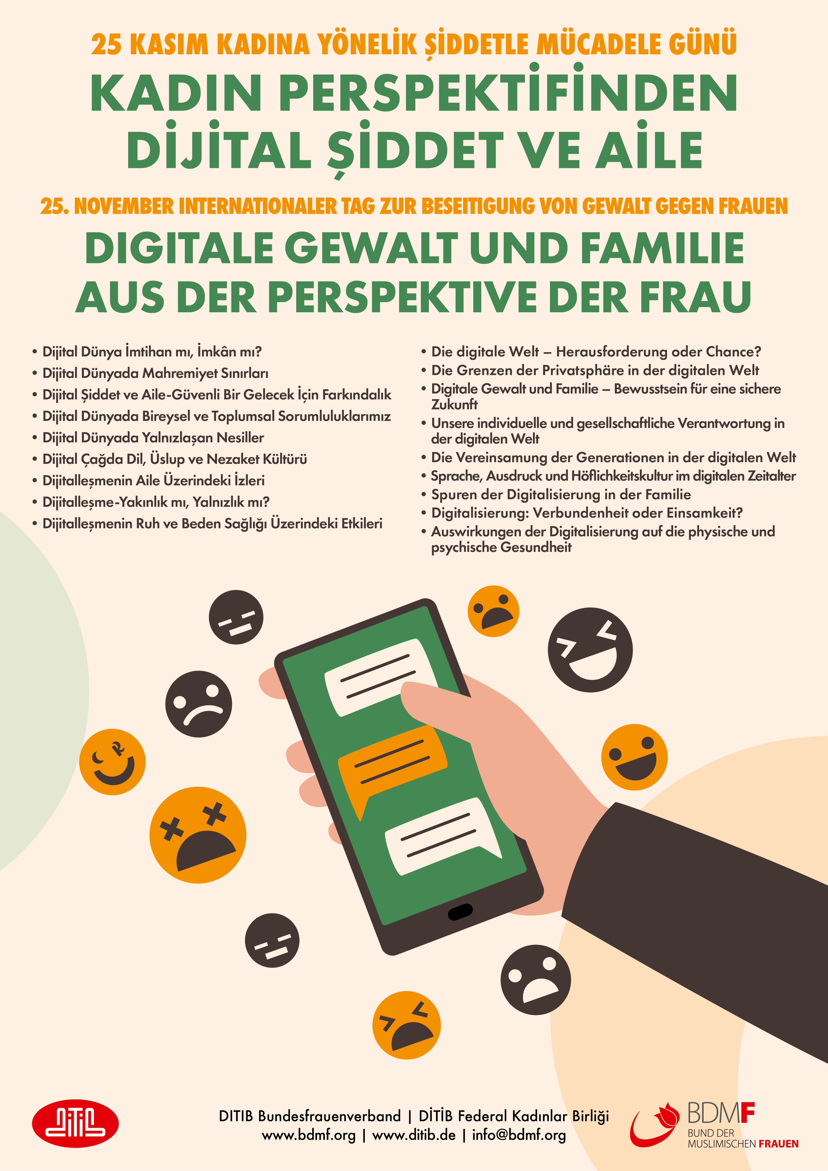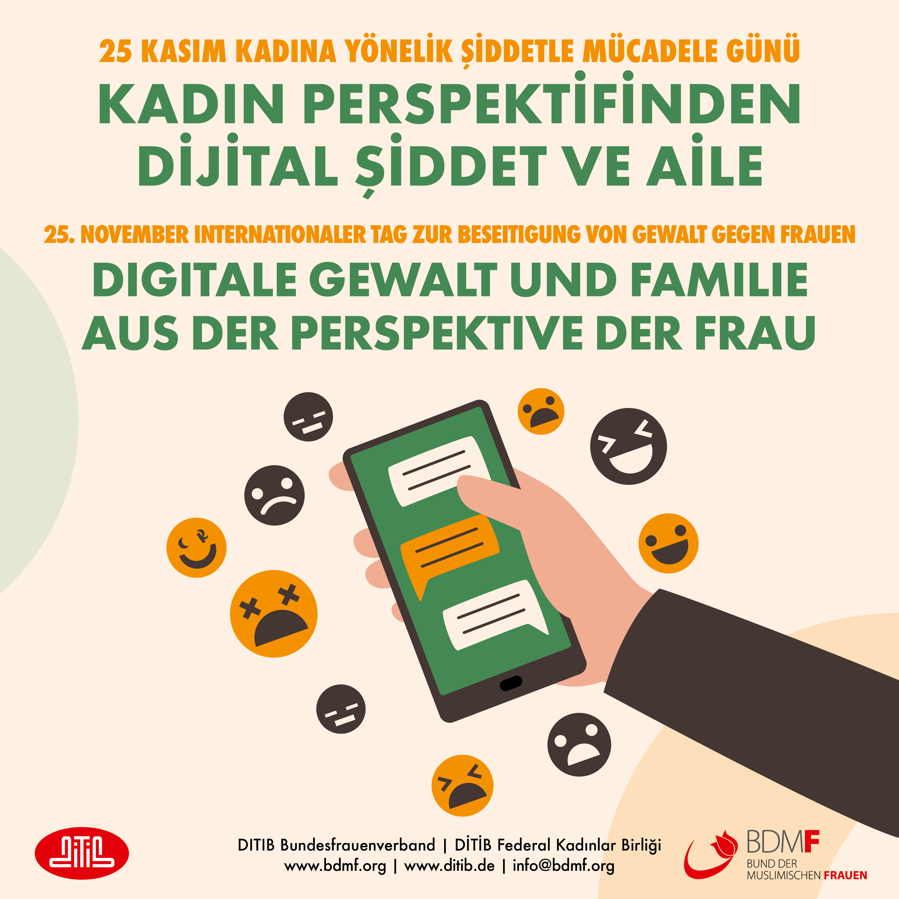 Köln, 25.11.2025 - 25 Kasım Uluslararası Kadına Yönelik Şiddetle Mücadele Günü vesilesiyle DİTİB Federal Kadın Birliği, her yıl şiddetin farklı yönlerine dikkat çekerek toplumu ve özellikle kadınları şiddetin ağır sonuçlarından korumayı amaçlayan sürdürülebilir ve etkili faaliyetler yürütmektedir. Bu yıl, 25 Kasım Kadına Yönelik Şiddetle Mücadele Günü’nde, dijital çağın beraberinde getirdiği dijital şiddet olgusuna dikkat çekmek, kadınların, annelerin ve ailelerin bu alanda bilinçlenmesini sağlamak amacıyla “Kadın Perspektifinden Dijital Şiddet ve Aile” başlıklı bir proje hazırlanmıştır.