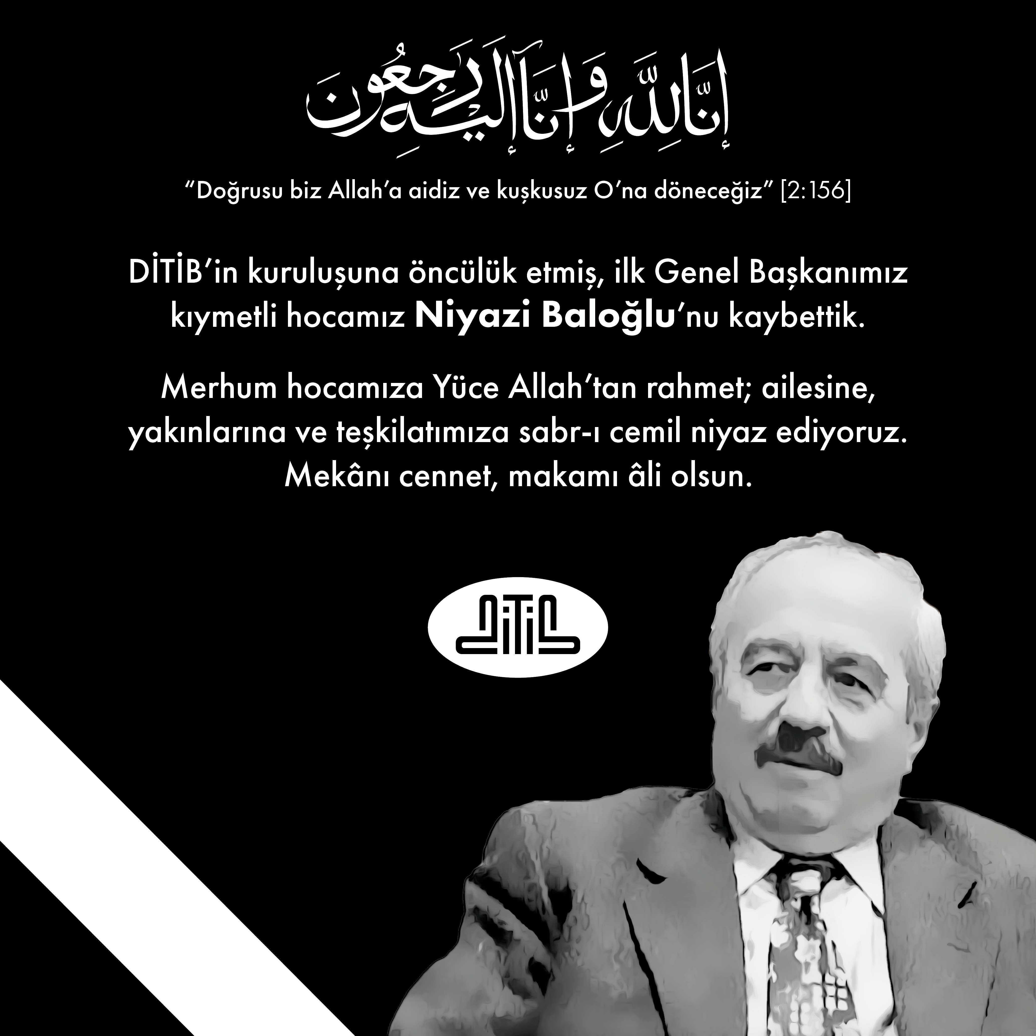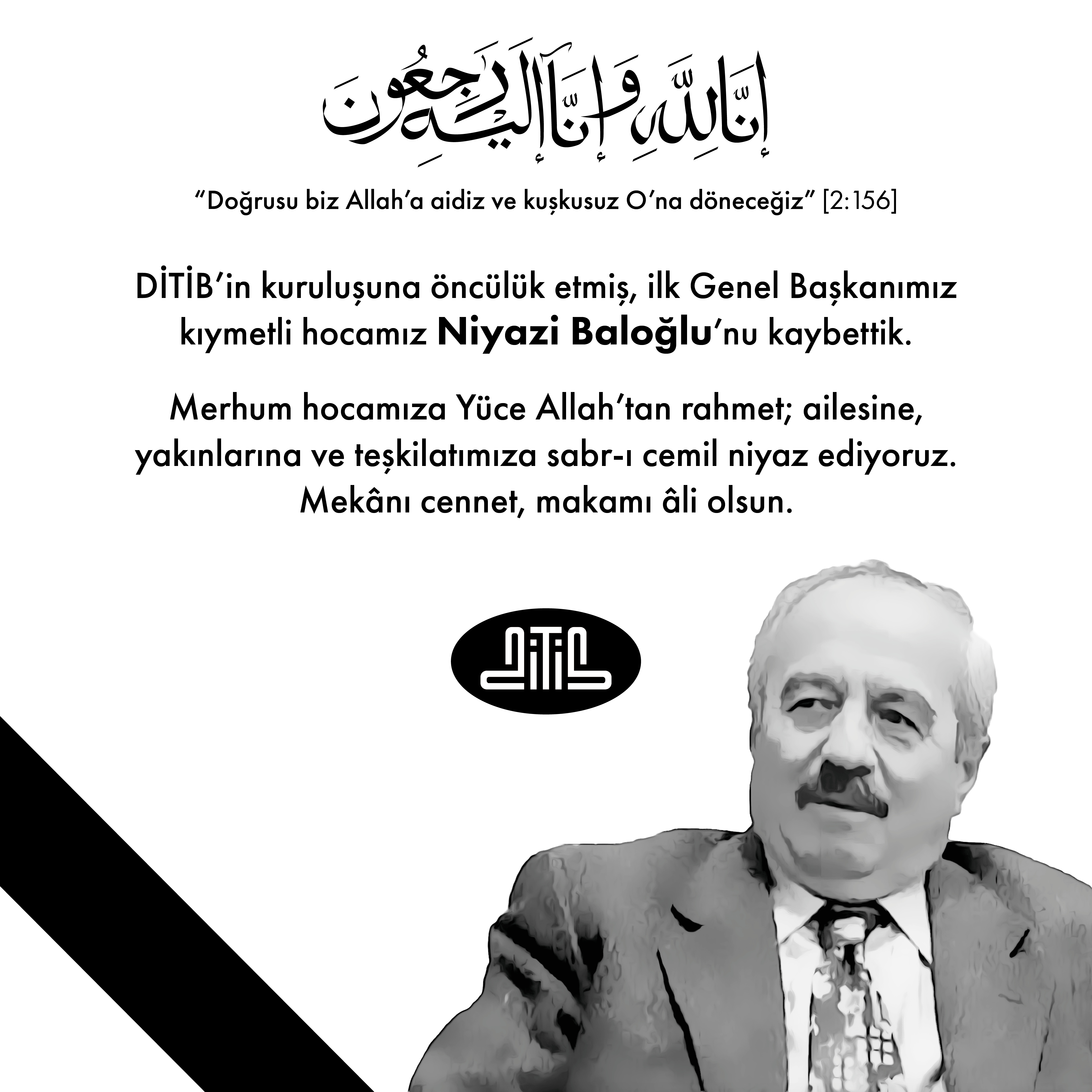 1983-1988 yılları arasında Almanya’da Din Hizmetleri Müşaviri ve 1985-1988 yılları arasında da DİTİB’in ilk Genel Başkanı olarak görev yapmış, DİTİB teşkilatlarının kuruluşa öncülük etmiş, hizmet ve gönül insanı kıymetli hocamız Niyazi Baloğlu’nu 17 Aralık 2025 tarihinde kaybetmenin derin hüznünü yaşıyoruz. Aynı zaman DİTİB Kurucu Genel Kurul Üyemiz olan olan merhum hocamıza DİTİB ailesi olarak minnet ve şükran borçluyuz.