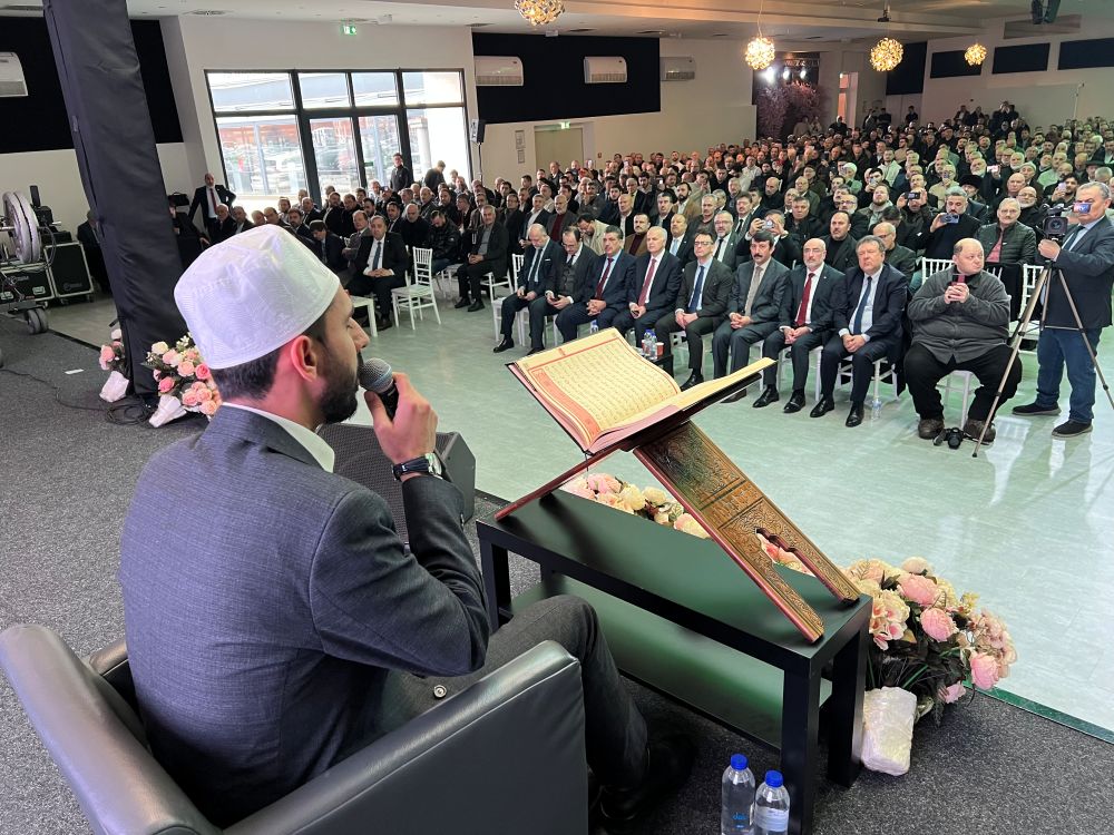 DİTİB Genel Başkanı Ramazan Ilıkkan yaptığı konuşmada, “Bu Kur’ân ziyafetine teşrif ettiğiniz için, Hazreti Kur’ân için burada bulunduğunuz için teşekkür ediyorum. Kur’ân şefaatçiniz olsun, ailenize huzur bereket versin” ifadelerini kullandı. Ilıkkan, DİTİB’in 40 yıllık hizmet sürecini şöyle özetledi: “DİTİB ailesi olarak yaklaşık 40 yıldır bu topraklarda sevgi ve barış içerisinde Kur’ân’ın ahlakıyla hizmet veriyoruz. Sevgi ve barış içerisinde hem kendi cemaatimize hem de içinde bulunduğumuz Almanya’nın sosyal barışı için birçok faaliyetler icra ediyorsunuz ve bunu huzur içerisinde yapıyorsunuz. Allah hepinizden razı olsun. Bu hizmetleri yaparken tek temel referansımız Hazreti Kur’ân’ın ahlakıdır, sevgidir, barıştır. Bu topraklarda geleceğimiz bu günlerden daha güzel olsun.”