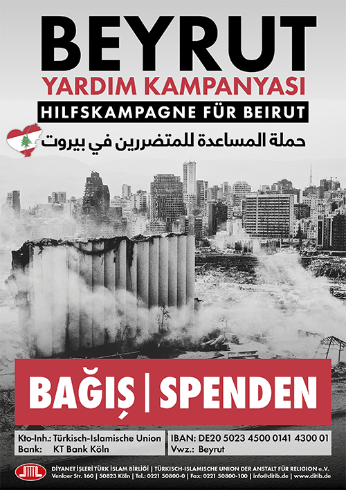 Lübnan'ın başkenti Beyrut'ta yaşanan yüzlerce kişinin ölümüne ve yaralanmasına, binlerce kişinin evsiz kalmasına neden olan patlama felaketi sonrası Almanya DİTİB camiası olarak bir yardım kampanyası başlatılmıştır.